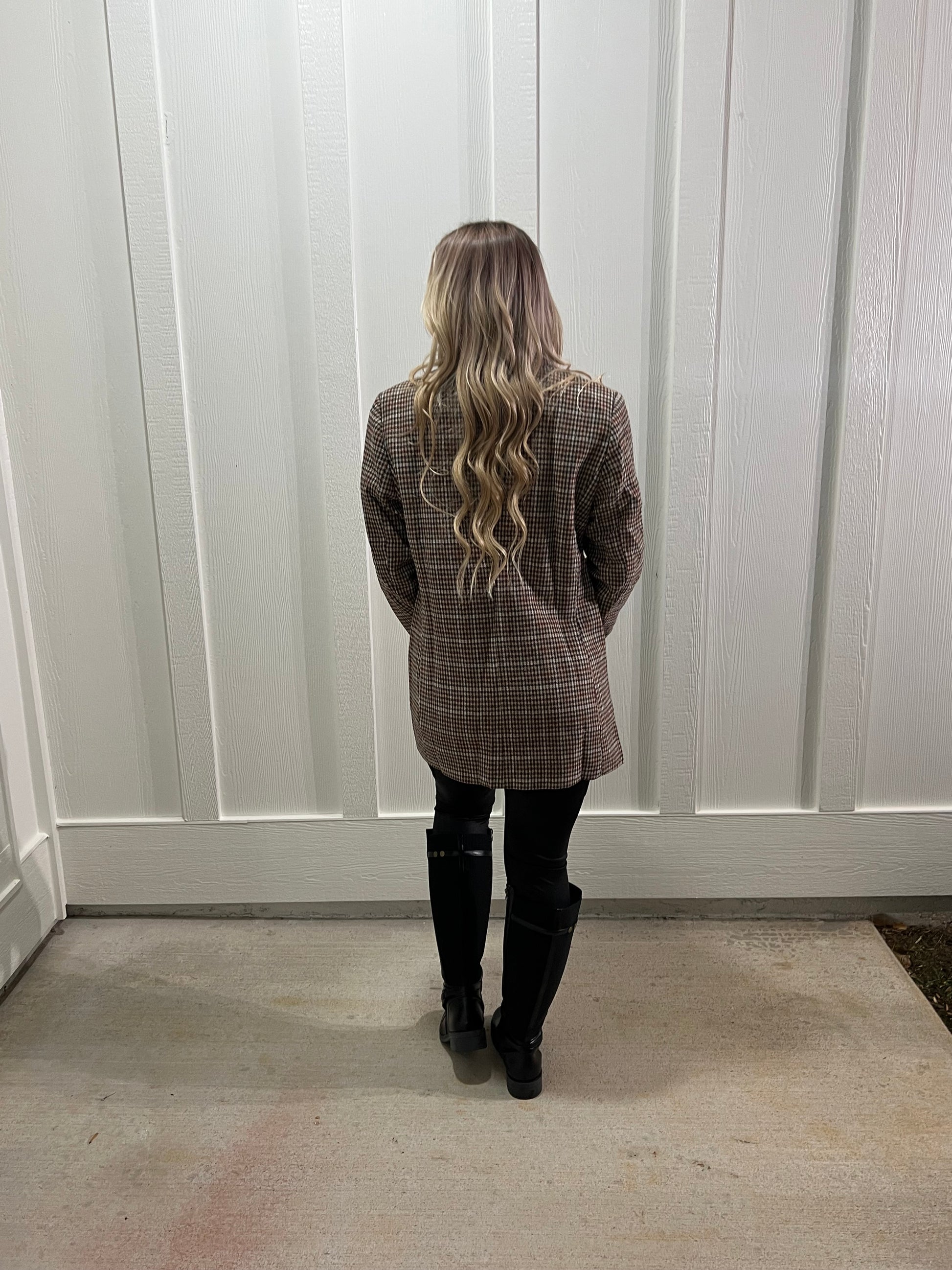 Designed with a tailored cut, elegant lapel neckline, double-breasted, and faux-wood button cuffs with Front pockets.