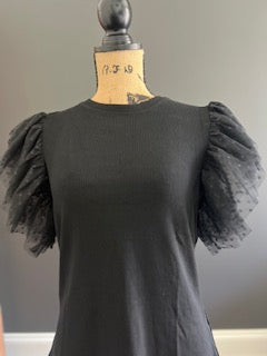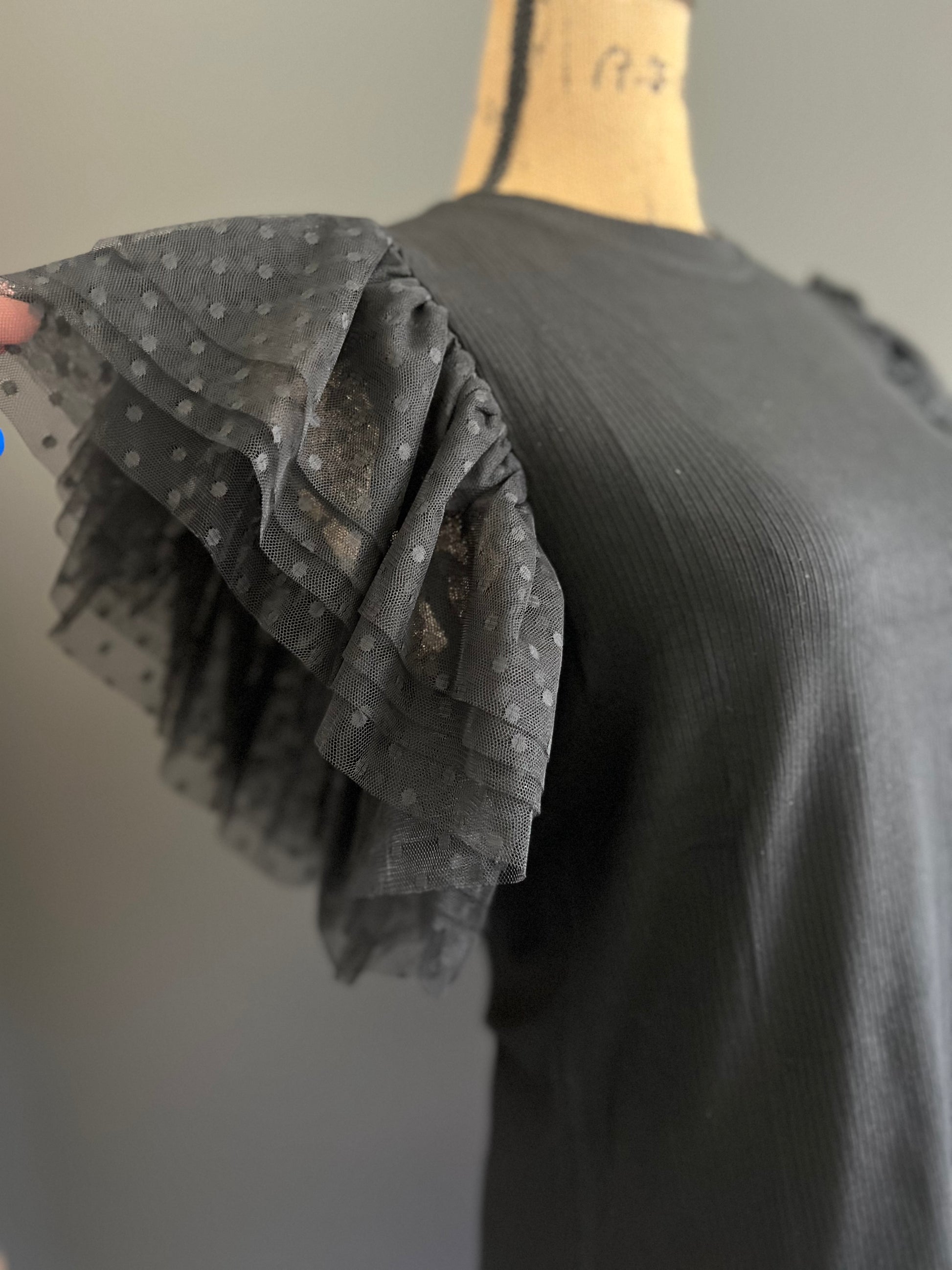 Dotty Mesh Ruffle Sleeve Ribbed Knit Top