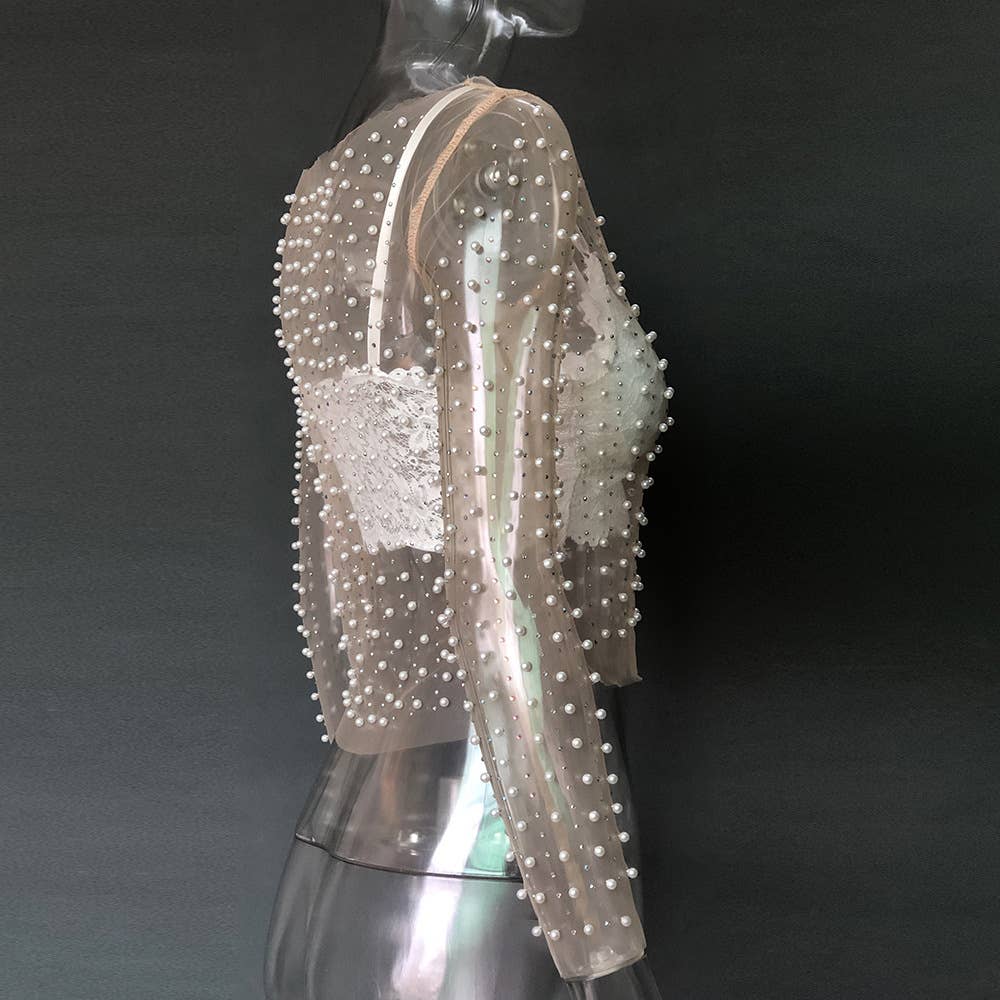 Pearl rhinestone sheer mesh see through top